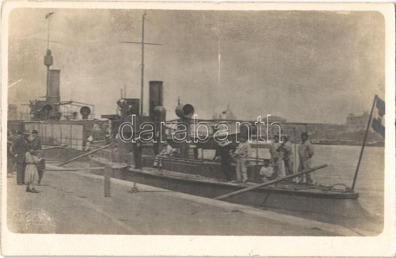 Description: Budapest, SMS "A" osztrák-magyar haditengerészet őrnaszádja a kikötőben, legénység a fedélzeten. Dunaflottilla / K.u.K. Kriegsmarine Donauflottille Patrouillenboot / WWI Austro-Hungarian Navy river patrol boat, mariners on board. photo