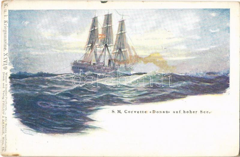 SM Schiff Donau Schraubenfregatte (gedeckte Korvette). K.u.K. Kriegsmarine / Az Osztrák-Magyar Haditengerészet SMS Donau csavaros fregattja / Austro-Hungarian Navy SMS Donau screw frigate. K.u.K. Kriegsmarine XXVI/9. Wiener Künstler-Postkarte Philipp & Kramer