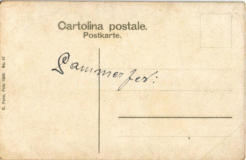 Description: SMS Zenta osztrák-magyar Zenta-osztályú védett cirkáló este / K.u.K. Kriegsmarine / Austro-Hungarian Navy SMS Zenta, Zenta-class armored cruiser at night, navy flag. G. Fano No. 47. (EB)