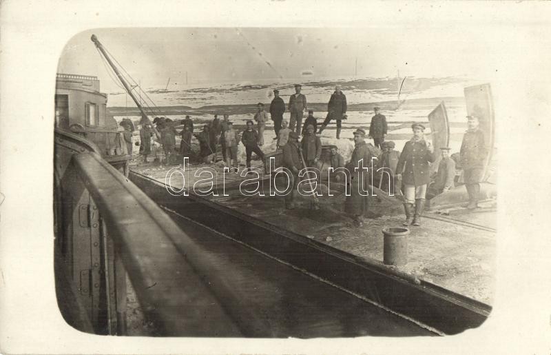 Szénszállító hajó, fedélzetén szenet lapátoló osztrák-magyar matrózokk...