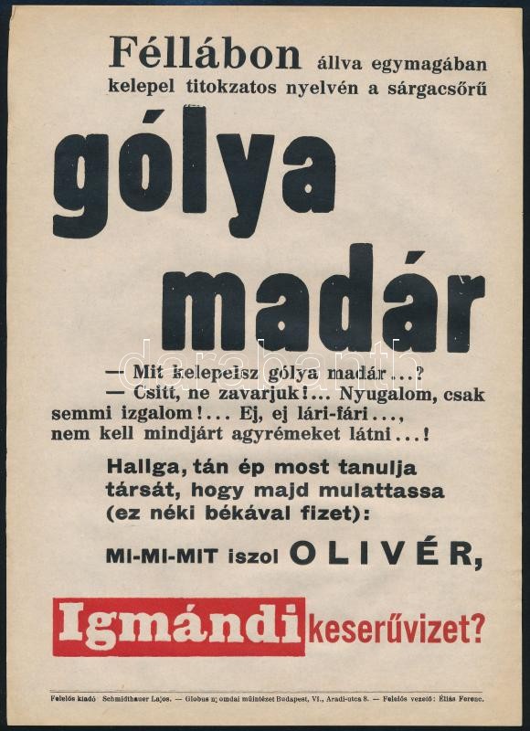 Féllábon állva egymagában kelepel titokzatos nyelvén a sárgacsőrű gólyamadár..., Igmándi keserűvíz reklámos villamosplakát, Globus nyomdai műintézet, 24×17 cm