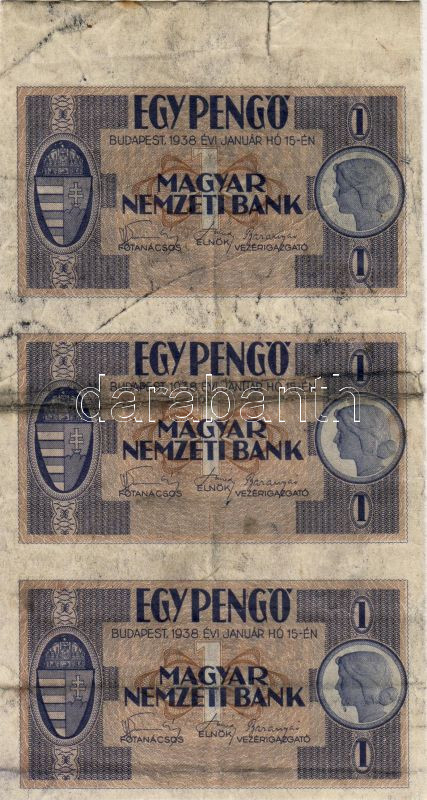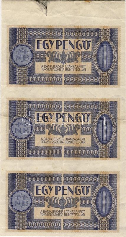 1938. 1P 3-as függőleges összefüggésben, sorozat és sorszám nélkül! Nyomdafestékes nyomokkal, ráncokkal, felül ívszéllel RRR!!!