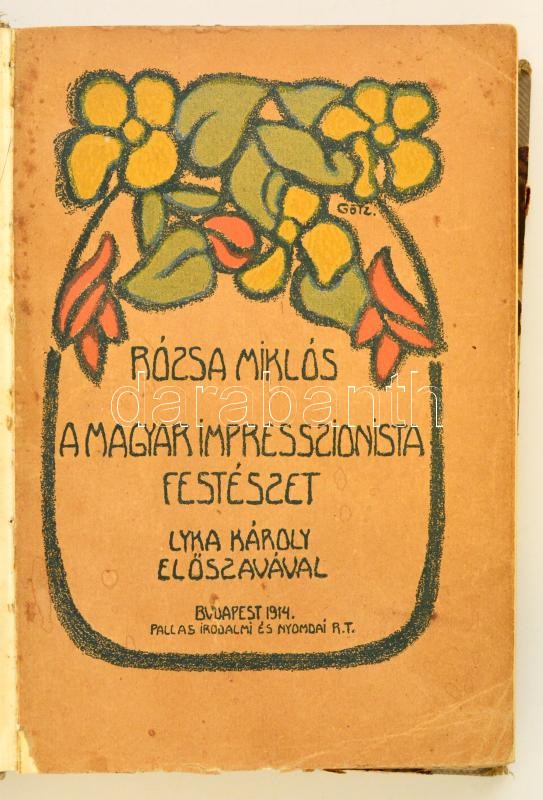 Description: Rózsa Miklós: A magyar impresszionista festészet. Lyka Károly előszavával. Götz Béla Ernő (1882-1941) grafikus, festőművész borítójával. Bp.,1914, Pallas Irodalmi és Nyomdai Rt., 12+299+1 p. Átkötött félvászon-kötés, az eredeti elülső papírborítót bekötötték, kopott borítóval.