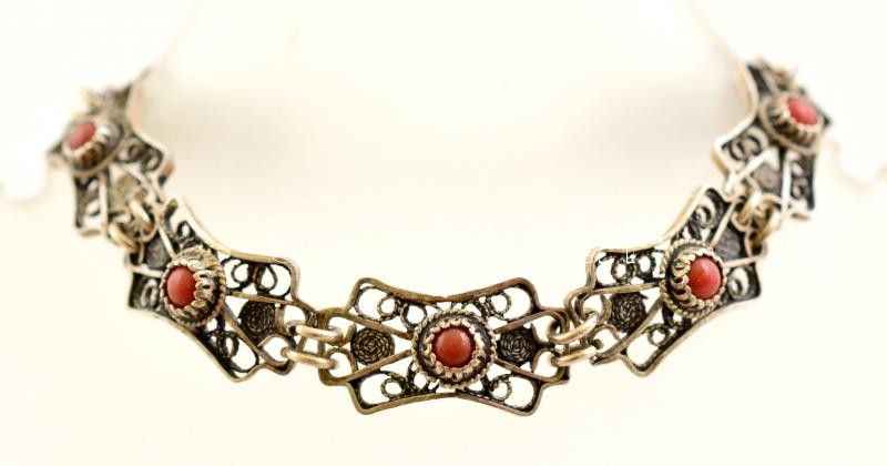 Ezüst(Ag) filigrán karkötő, korall díszítéssel, jelzés nélkül, h: 15 c...