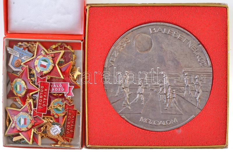 Description: Vegyes magyar szocialista tétel, közte ~1980. "Fővárosi Szállításai Vállalat - 30 éves törzsgárda tagságáért" emlékérem tokban, "500 ezer kilométer" zománcozott fém jelvény T:2