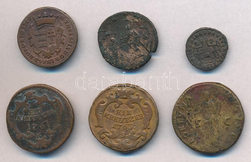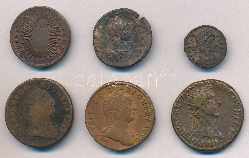6db-os vegyes magyar és külföldi rézpénz tétel, közte 3db római T:2-,3