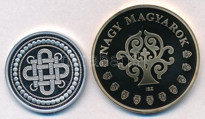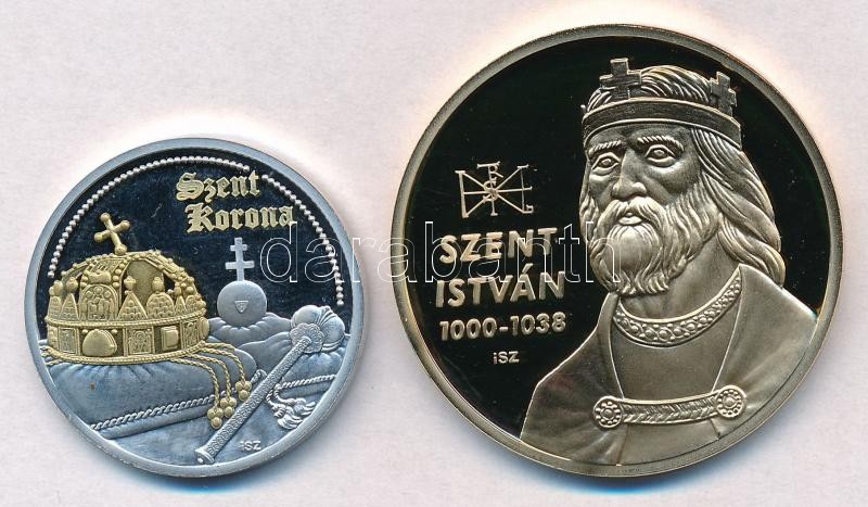 Description: Ifj. Szlávics László (1959-) DN "Szent Korona emlékérem" részben aranyozott, peremén jelzett Ag emlékérem (10g/0.925/30mm) + 2011. "Nagy Magyarok / Szent István 1000-1038" aranyozott Cu emlékérem (40mm) T:PP