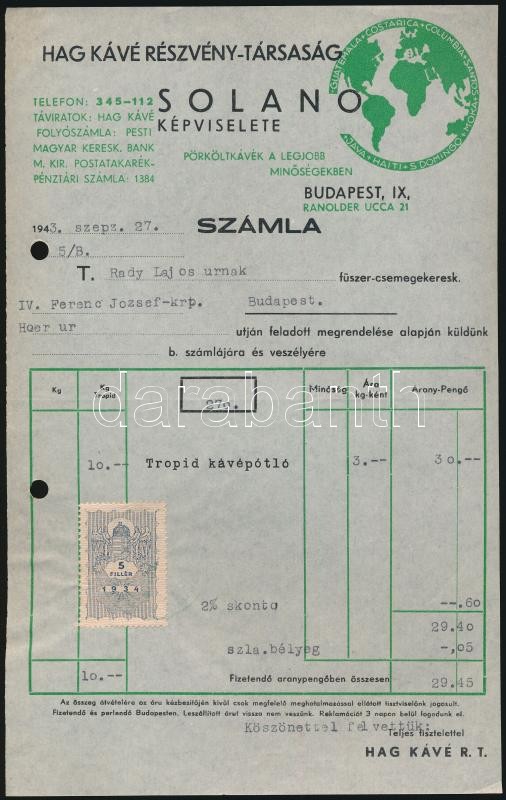1915-1943 3 db díszes fejléces számla okmánybélyegekkel (Tente Gyermekkocsi, Hag Kávé Részvénytársaság, Herz Mór)