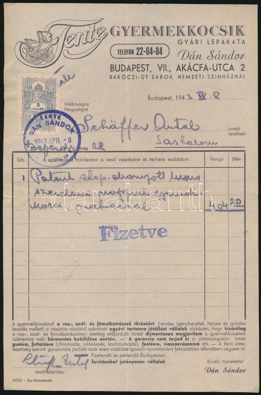 1915-1943 3 db díszes fejléces számla okmánybélyegekkel (Tente Gyermek...