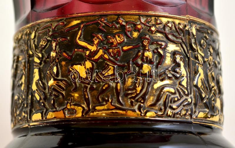 Description: Moser Karlsbad (Made in Czechoslovakia ) Formába öntött ametisztszínű váza, palástján savmaratott és políraranyozott mitológiai jelenettel, kopott aranyozás, nagyon apró csorbával, jelzés nélkül, m: 9,5 cm, d:10,5 cm