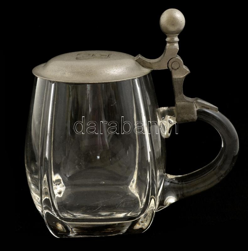 XX. sz. eleje. Metszett üveg korsó, ón fedéllel, monogrammal