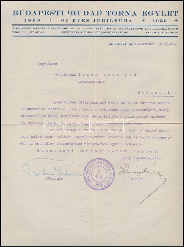 1929 a Budapesti Torna Club vezetőségének részvétnyilvánító levele isz... https://www.darabanth.com/en/320-Online-auction/320.0/Other-collectibles/Historical-documents-manuscripts~500018/1929-a-Budapesti-Torna-Club-vezetosegenek-reszvetnyilvanito-levele-iszeni-Iszer-Karoly-186~II1769911