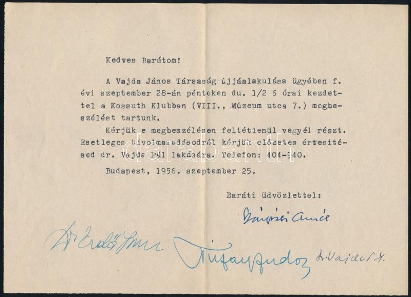 Description: 1956 Vajda János Társaság újjáalakulása ügyében tartandó megbeszélés értesítője rajta Kárpáti Aurél (1884-1963) író, kritikus, költő, Dr. Vajda Pál (1907-1982) technikatörténeti szakíró, ügyvezető elnök, Dr. Erdős Imre, és Tiszai András aláírásával.