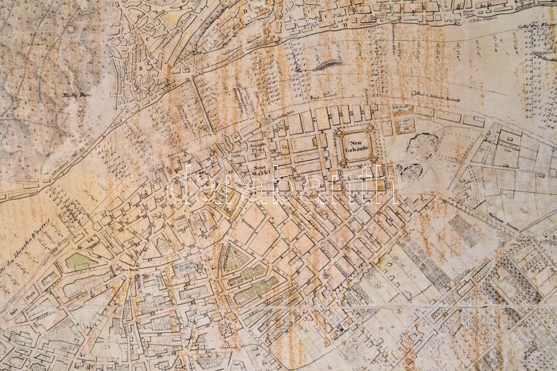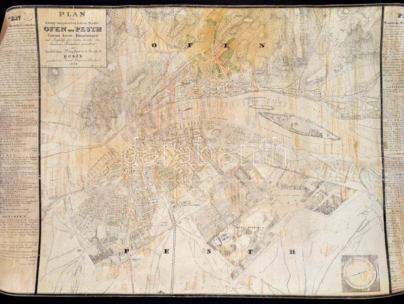 1838 Blaschnek Samuel Benjámin (1789-1854): Plan der königl. ungarischen freyen Städte Ofen und Pesth sammt derren Umgebungen. Statisztikai táblákkal és magyarázatokkal. Részletes térkép sarokház-számozással, a főbb épületek alaprajzával, hajózási és vízrajzi adatokkal, Buda és Pest statisztikai adataival. Későbbi kartonra kasírova, feltekerve, erősen restaurálni való állapotban, több beszakadással, 89x60 cm
