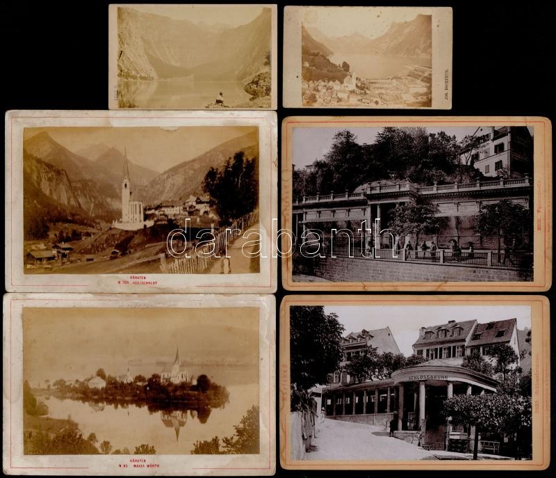 cca 1900 Városképes, tájképes fotók (Karlsbad környéke, Eggenberg bei Graz, Maria Wörth, Heiligenblut, Schlossbrunn, Traunkirchen), 12 db, 6x8,5 és 10,5x16 cm / 12 photos (Karlsbad környéke, Eggenberg bei Graz, Maria Wörth, Heiligenblut, Schlossbrunn, Traunkirchen)