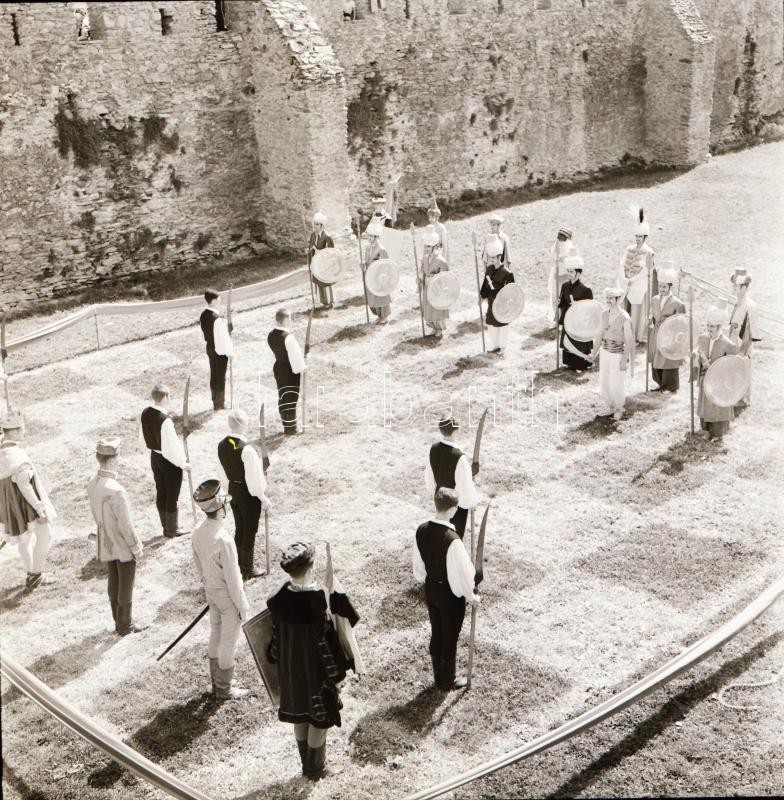 cca 1969 Élő sakkfigurák (törökök-magyarok) felvonulása és játéka egy vár tövében, gyeptáblán, 3 db szabadon felhasználható vintage negatív, 6x6 cm
