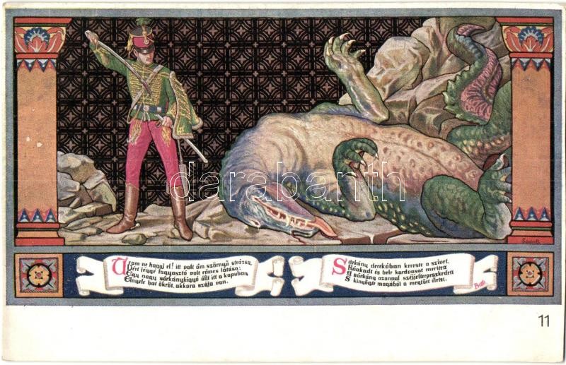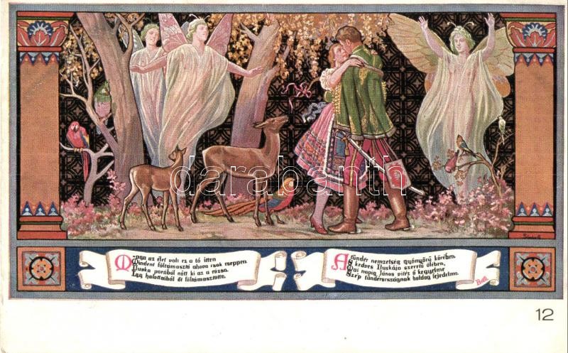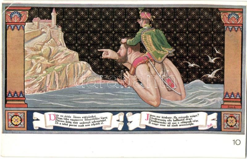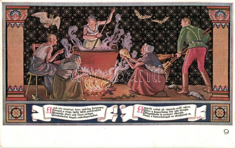 Description: Budapest V. Erzsébet Királyné Szálló étterem és söröző pince, Sándor Béla falfestménye Petőfi Sándor János vitézéből - 9 darabos képeslap sorozat / art postcard series with 9 postcards