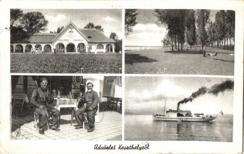 Keszthely, Halász csárda, étterem, automobil gőzhajó, strand, iszogató...