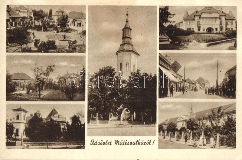 Mátészalka, mozaiklap: Alispáni hivatal, Vármegyei kórház, Polgári iskola, Református templom, stb. (EK)