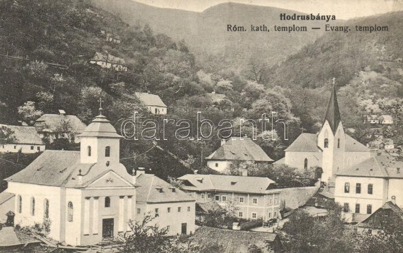 Description: Hodrusbánya, Banská Hodrusa (Hodrushámor, Hodrusa-Hámre); Római katolikus templom, Evangélikus templom. Weisz Jakab kiadása / Catholic church, Lutheran church (Rb)