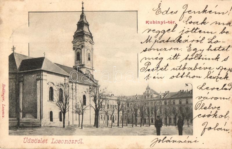 Losonc, Lucenec; Kubinyi tér, templom. Redlinger kiadása / square, church