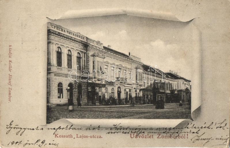 Zombor, Sombor; Kossuth Lajos utca, Dreher sörcsarnok, Kollár József üzlete és saját kiadása / street view, beer hall, shops (EK)