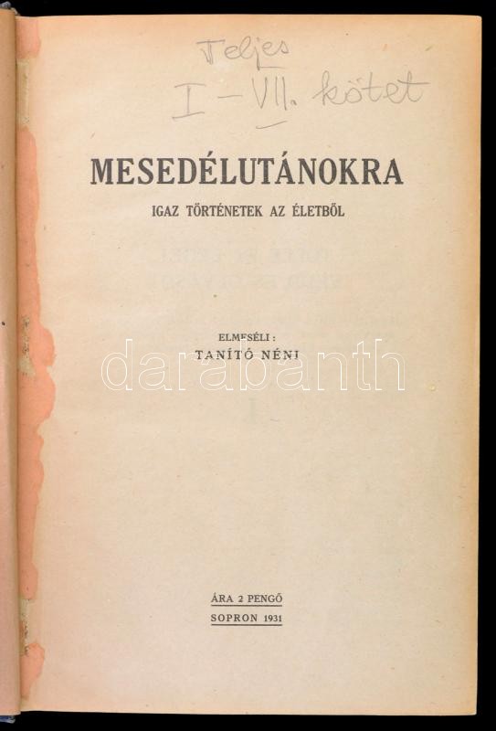 Description: Tanító néni [Csizmadia József Alajos]: Mesedélutánokra. Igaz történetek az életből. 1-7. köt. Sopron, 1931-1936, Goldschmied Sándor Nyomda. A hét kötet egybekötve. Félvászon kötésben, jó állapotban.