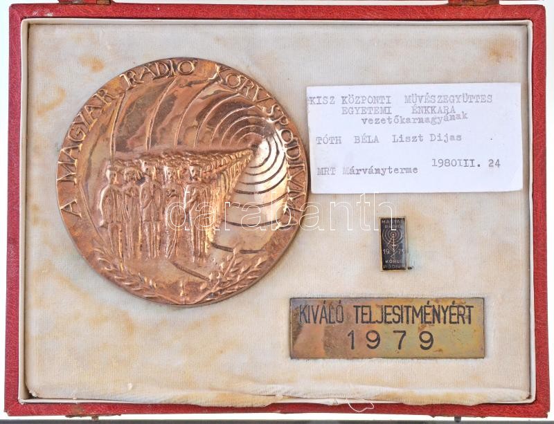 Description: Kiss Sándor (1925-1999) 1979. "A Magyar Rádió Kóruspódiuma" egyoldalas Br plakett eredeti, sérült dísztokban, valamint kisméretű "Kiváló Teljesítményért 1979" plakettel (102mm) T:1-,2