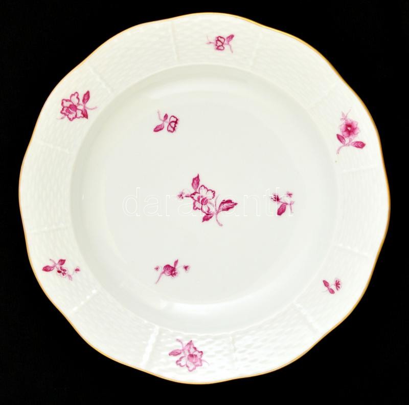 Herendi virágmintás tányér, kézzel festett, jelzett (koronás), kopásokkal, d: 24,5 cm