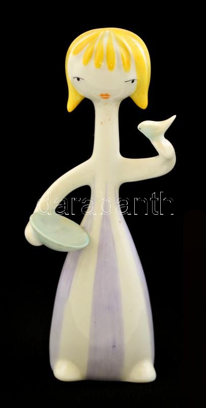 Hollóházi madaras lány, kézzel festett, jelzett, hibátlan, m:14 cm