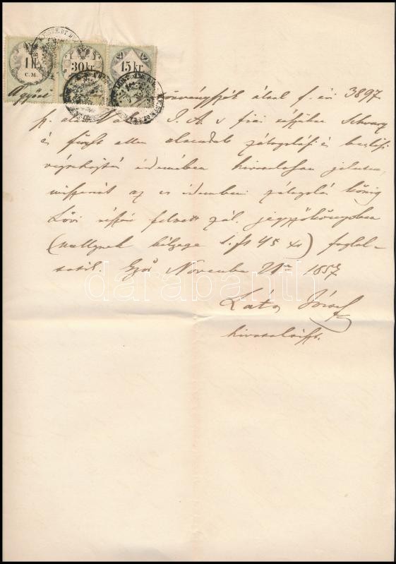 https://www.darabanth.com/en/321-Online-auction/321.0/Other-collectibles/Document-Stamps~500015/1857-Okmany-1Fl-CM-plus-30kr-plus15-kr-CM-illetekbelyegekkel~II1774598