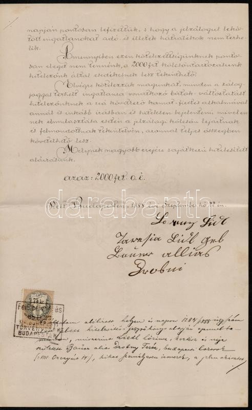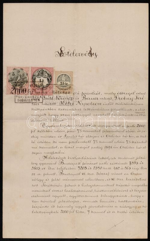 1888 1 db 5 ft., 1 db 1 ft., 1 db 25 kr és egy 75 kr. okmánybélyeg egy 2000 forintról szóló kötelezvényen