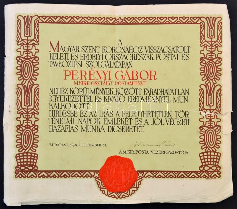 Description: 1940 A magyar Szent Koronához visszacsatolt Erdélyi és keleti országrészek postai távközlési szolgálatában töltött munkáért adott elismerő oklevél. Beszakadásokkal 31x27 cm
