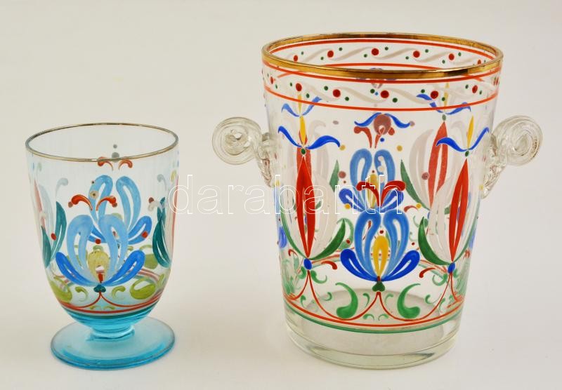 cca 1920 Parádi szőlőmosó és talpas pohár, kézzel festett, jelzett (Parád), kopott, m:15 és 10 cm