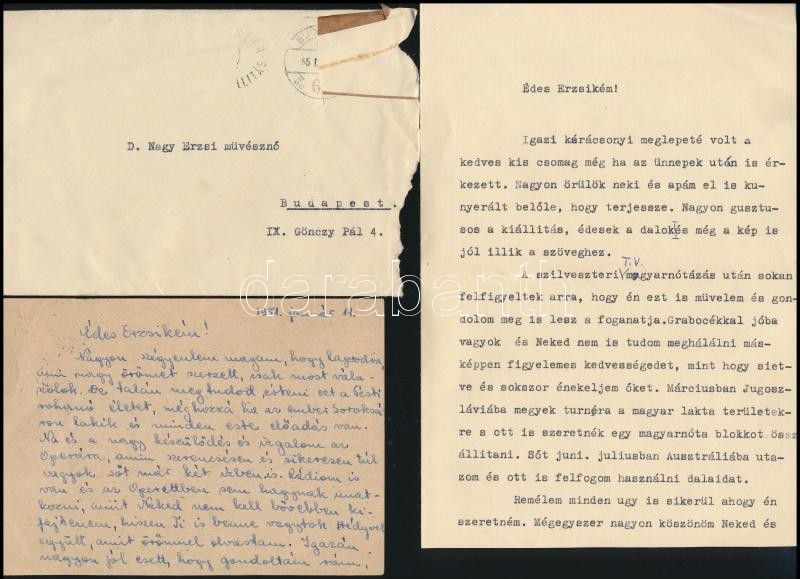 1951 Zentai Anna (1924-2017) színésznő 2 db levele (gépelt, ill. kézzel írt) D. Nagy Erzsébet (1923-1982) költőnő részére, 1 db borítékkal