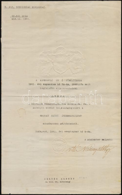 Description: 1941 Magyar ezüst érdemkereszt adományozó Illyés Albert (?-?) helyettes alhadnagy részére a Délvidék visszafoglalásakor szerzett érdemeiért, Náday István (1888-1954) altábornagy, későbbi vezérezredes aláírásával
