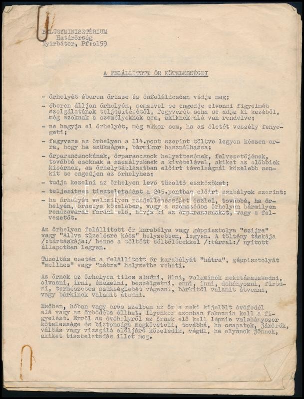 1965 A felállított őr kötelességei, Belügyminisztérium Határőrség gépirata, Kiképző Ezred parancsnokának aláírásával