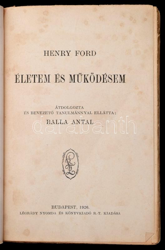 Henry Ford: Életem és működésem. Átdolgozta és bevezető tanulmánnyal e... https://www.darabanth.com/en/322-Online-auction/322.0/Books/Books-Other-rarities~1000016/Henry-Ford-Eletem-es-mukodesem-Atdolgozta-es-bevezeto-tanulmannyal-ellatta-Balla-Antal~II1786219