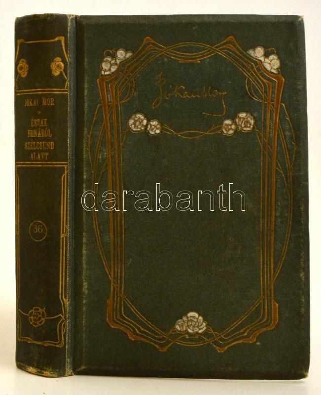 Description: Jókai Mór: Észak honából. Szélcsend alatt. Bp., 1912, Franklin-Társulat. Hetedik kiadás. Kiadói aranyozott, festett szecessziós egészvászon-kötés, kissé kopott gerince és a hátsó borítója.