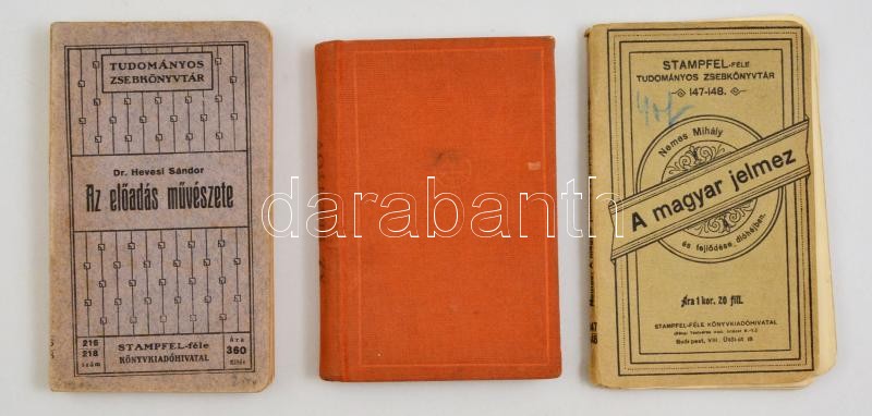Description: Vegyes könyv tétel, 3 db: Végh István: Az erényöv. Bp., é. n., Rózsavölgyi és Társa. Kiadói egészvászon kötésben. Dr. Hevesi Sándor: Az előadás művészete. Bp., 1908, Stampfel-féle Könyvkiadó. Kiadói papírkötésben. Nemes Mihály: A magyar jelmez és fejlődése dióhéjban. Bp., 1903. Stampfel-féle Könyvkiadó.
