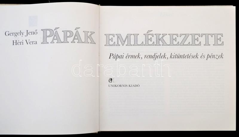 Gergely Jenő - Héri Vera: Pápák emlékezete. Pápai érmek, rendjelek, kitüntetések és pénzek. Bp.,1991, Unikornis Kiadó. Kiadói egészvászon-kötés.