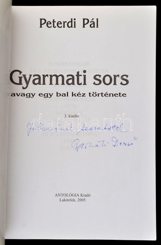 Peterdi Pál: Gyarmati sors avagy egy bal kéz története. Lakitelek,2005, Antológia Kiadó. Kiadói papírkötés. Gyarmati Dezső (1927-2013) vízilabdázó, szakadző, olimpiai-, európa-bajnok, mint edző Olimpiai-, európa- és világbajnok dedikációjával.