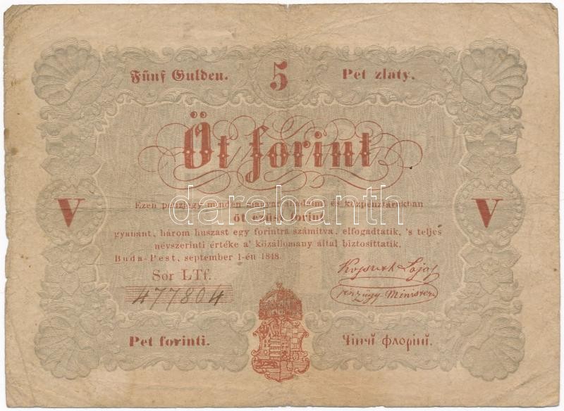 https://www.darabanth.com/en/322-Online-auction/322.0/Numismatics/Hungarian-Banknotes~2500007/1848-5Ft-Kossuth-banko-vorosesbarna-TIII-kis-szakadas-Adamo-G109~II1782598