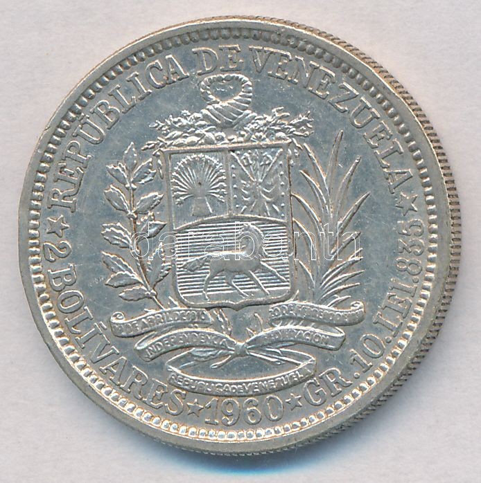 https://www.darabanth.com/en/322-Online-auction/322.0/Numismatics/Worldwide-silver-and-metal-coins~2500013/Venezuela-1960-2B-Ag-T1--Venezuela-1960-2-Bolivares-Ag-CAU~II1783702