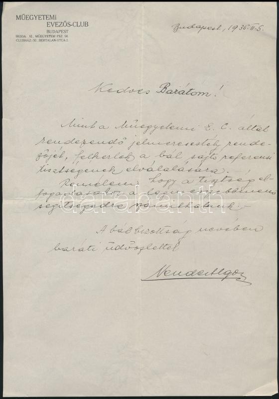 1935 Bp., A Műegyetemi Evezős-Club jelmezestélyének sajtóreferensi tisztségére szóló felkérés, főtitkár aláírásával + boríték