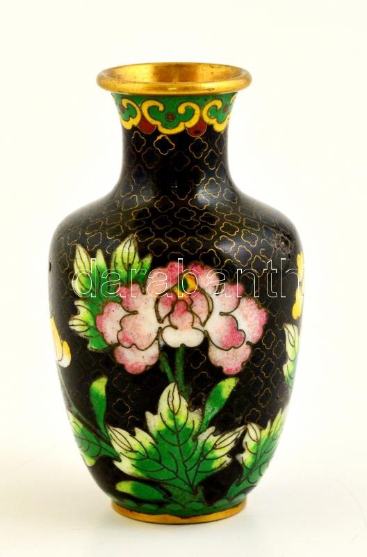 Virágmintás zománcozott réz váza, sérüléssel, m: 10 cm