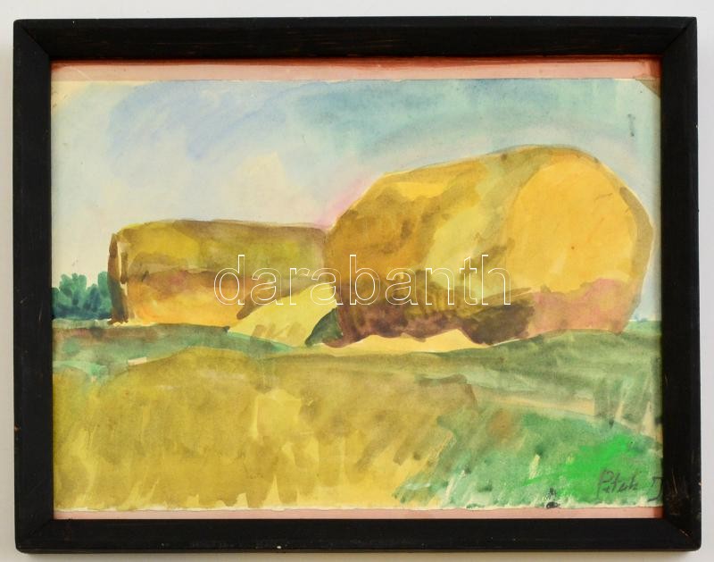 Pituk jelzéssel: Szénabálák. Akvarell, papír, üvegezett keretben 21×30...