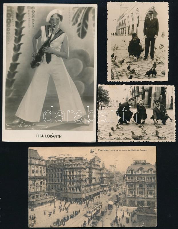 Illa Loránth (?-?) revüsztár, 3 db fotó + 1 db brüsszeli üdvözlőlap,, különböző méretben