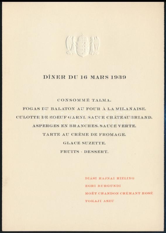 1939 Francia nyelvű étlap, koronás-angyalos magyar kiscímeres papíron