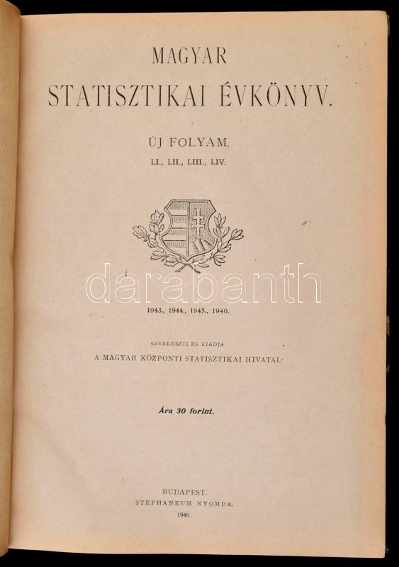 1948 Magyar statisztikai évkönyve. Új folyam. LI., LII.,LIII.,LIV. 1943.,1944.,1945.,1946. Szerk.: Magyar Központi Statisztikai Hivatal. Bp.,1948, Stephaneum, XII+298+III p. Kiadói félvászon-kötés, kissé kopott borÃtóval, jó állapotban.